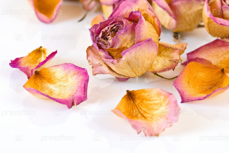 Засохшая роза и лепестки на белом фоне
