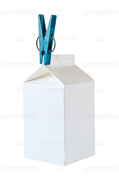 Прищепка на пакете молока, изолированные на белом фоне