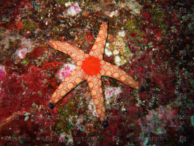 Красная морская звезда на дне океана