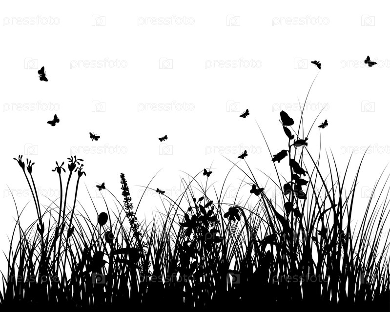 Векторный фон с травой, цветами и бабочками