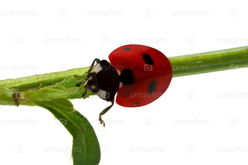 Божья коровка, сидящая на ветке на белом фоне