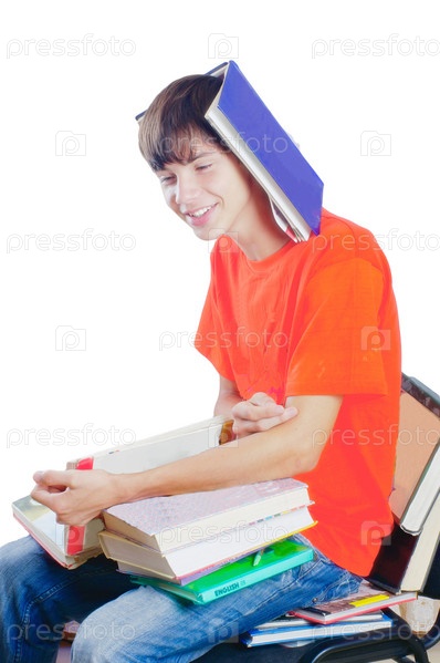 Улыбающийся подросток сидит с книгами
