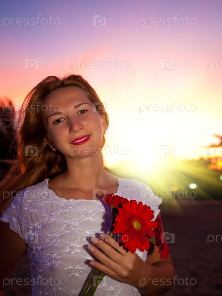 Молодая женщина с цветами на фоне заката