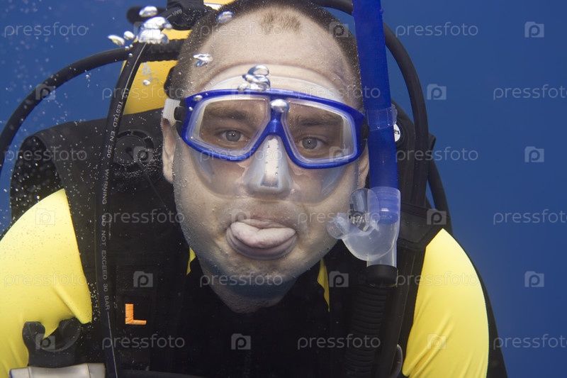 Дайвер под водой показывает язык