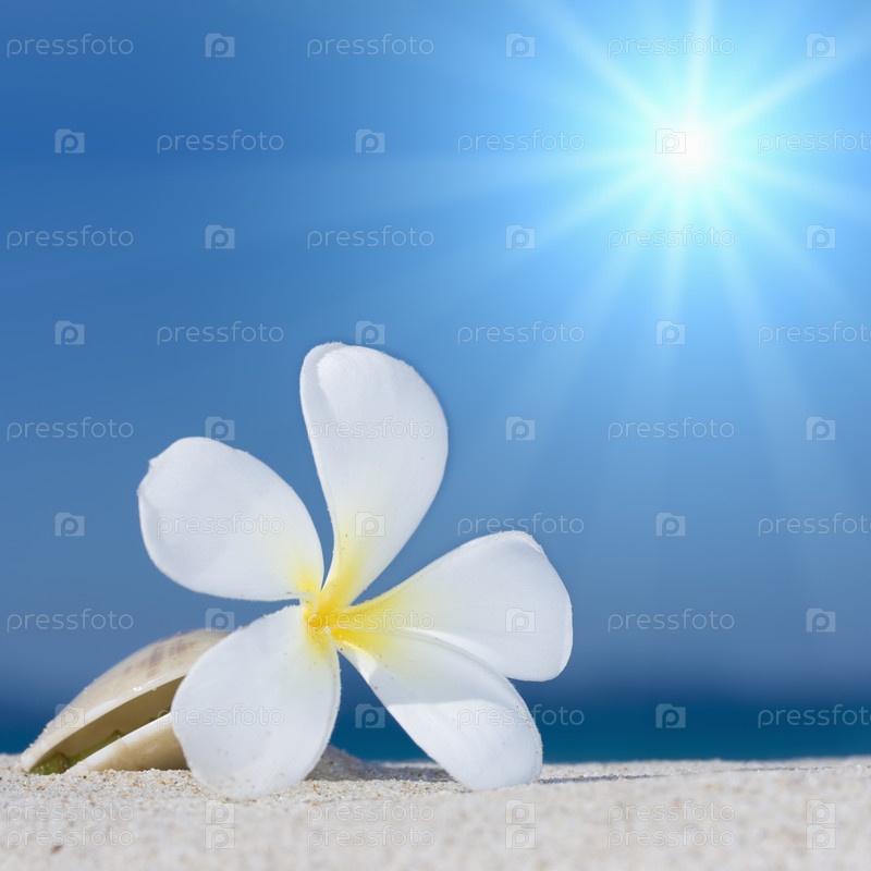 Цветок плумерии и ракушка на морском пляже на фоне солнечного голубого неба