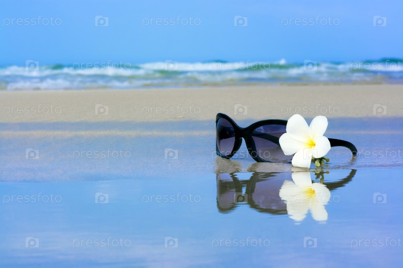 Солнцезащитные очки и цветок плумерии на морском пляже