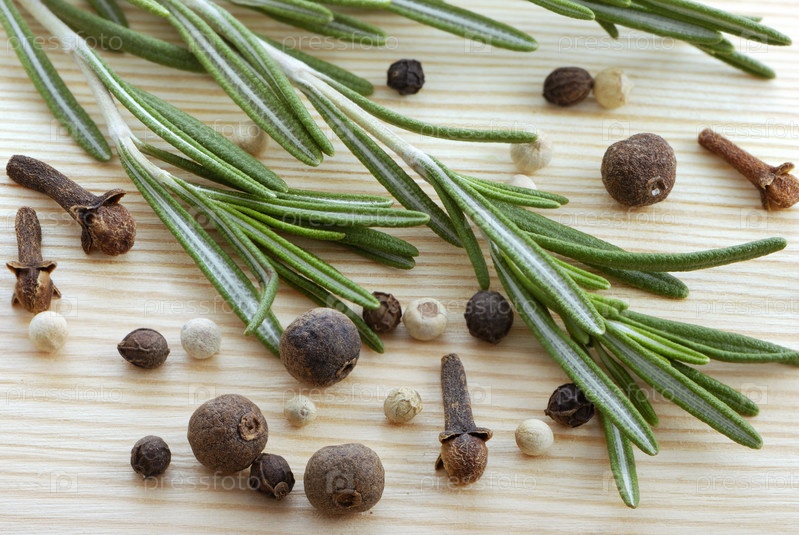 Розмарин, перец и гвоздика на деревянном столе