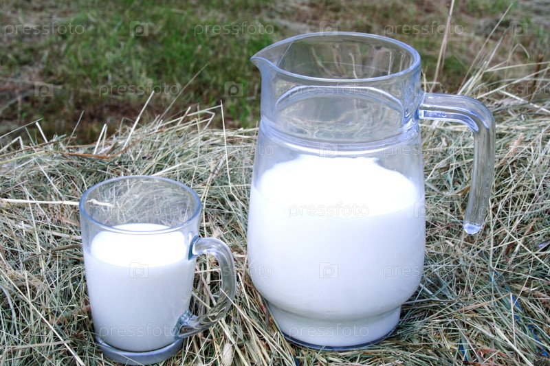 Молоко в стеклянном кувшине и кружке стоит на стоге сена