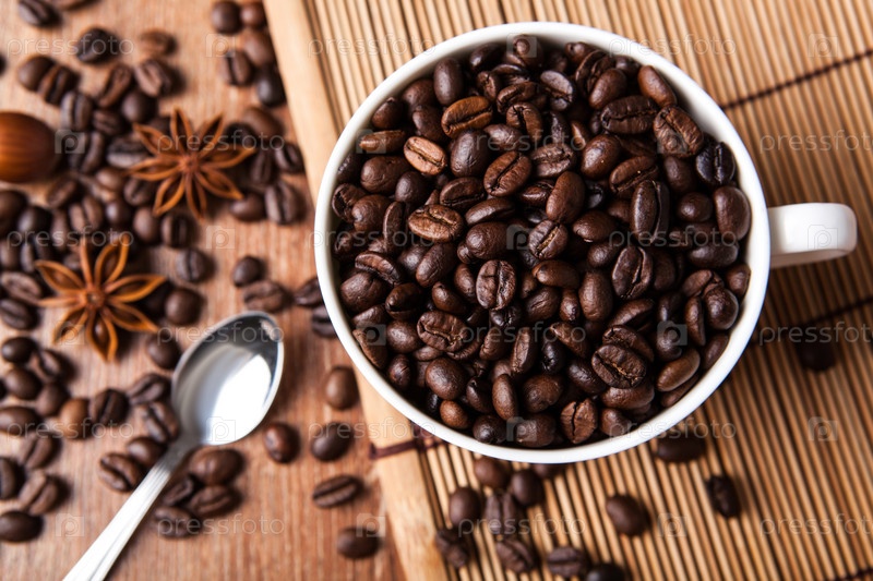 Кофе в зернах в чашке на столе