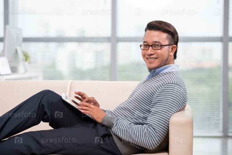 Вьетнамский мужчина с цифровым планшетом