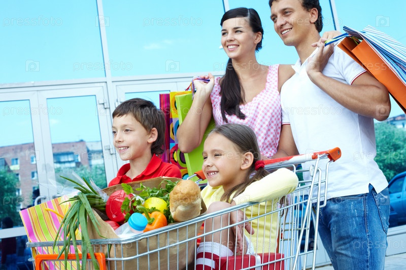 Счастливая семья у супермаркета с покупками