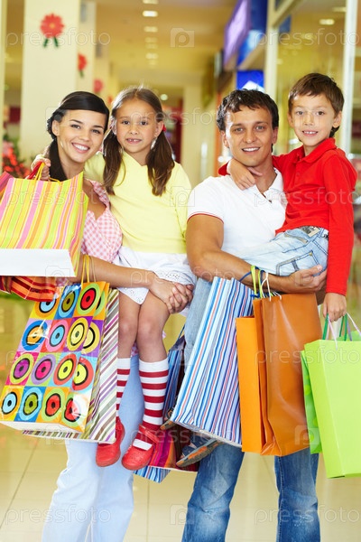 Семья из четырех человек в торговом центре с покупками