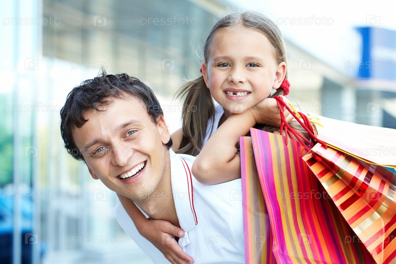 Папа с дочкой у торгового центра с покупками