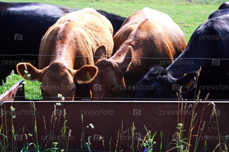 Коровы пьют воду из поилки на зеленом поле