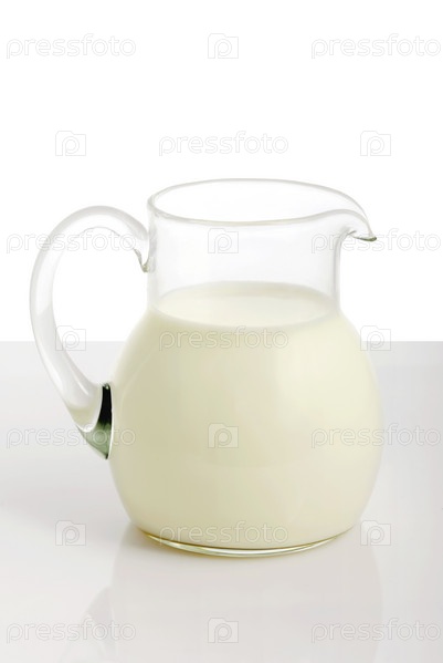 Стеклянный кувшин с молоком на белом фоне