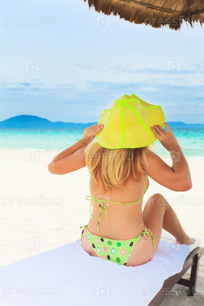 Женщина в желтой шляпе загорает на пляже, сидя на шезлонге