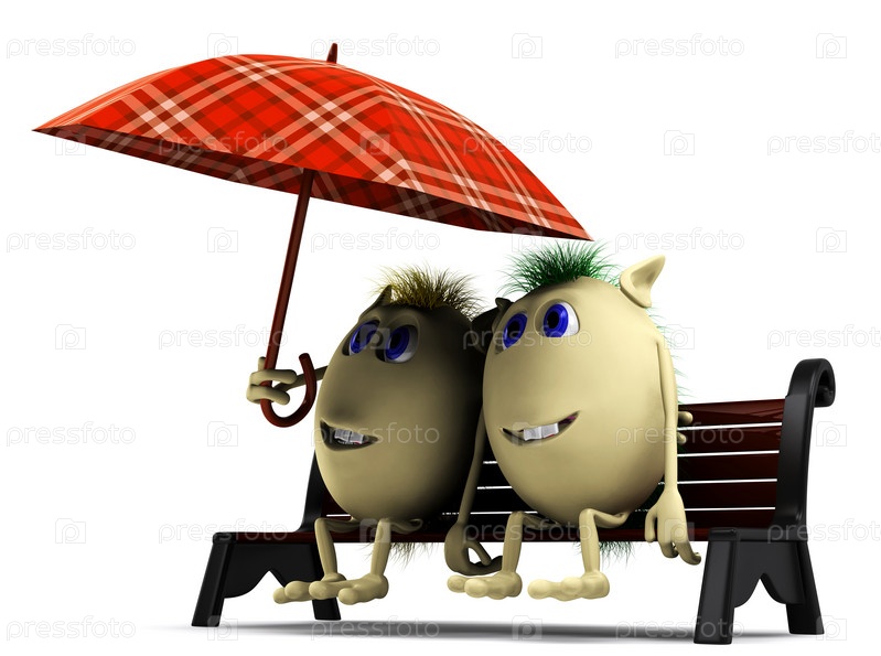 Две счастливые куклы под большим зонтом на скамейке