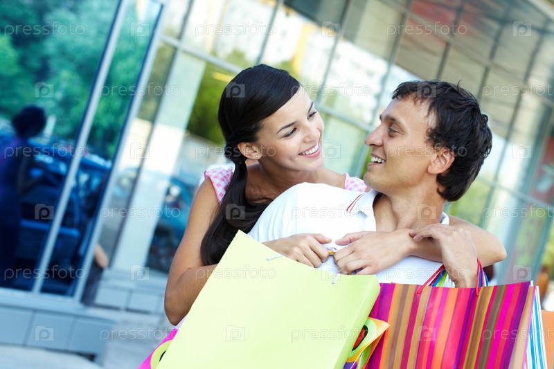 Счастливая молодая пара с покупками