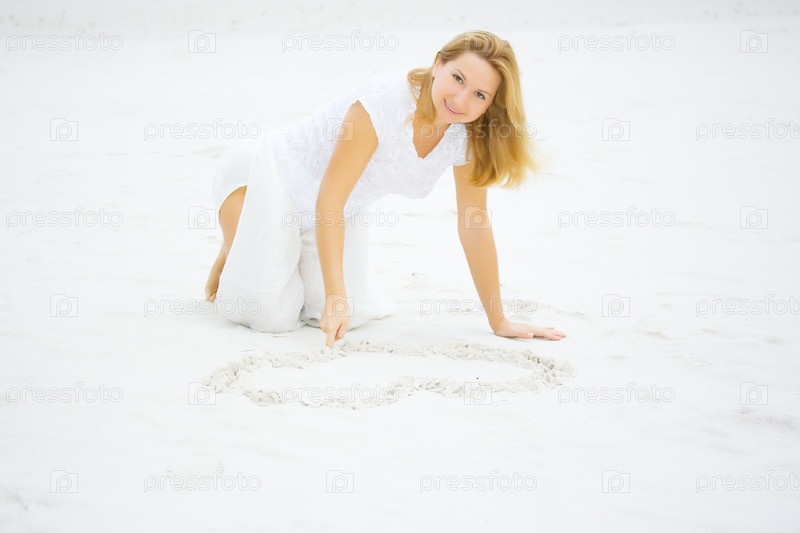 Молодая женщина рисует сердце на белом песке