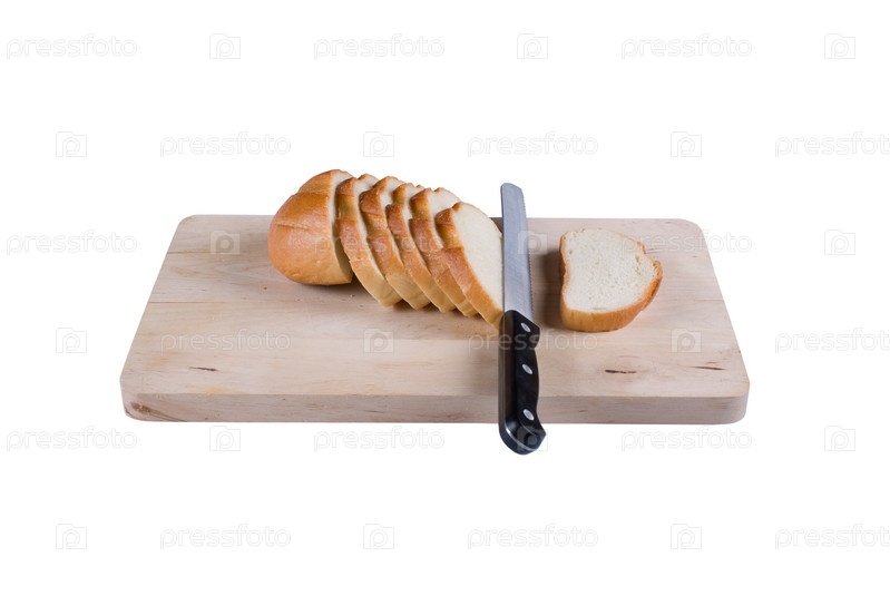 Хлеб, нарезанный на доске для резки.Он изолирован, на белом фоне