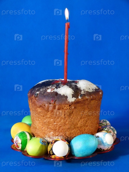 Пасхальный кулич со свечой и крашеные яйца