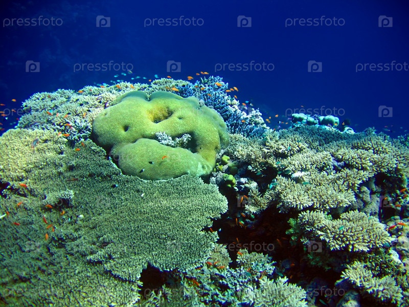 Подводный пейзаж с большим количеством маленьких рыб и кораллов