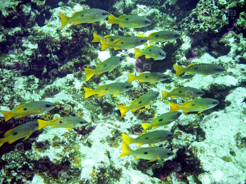 Подводный пейзаж со стаей маленьких рыб