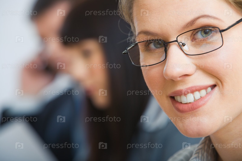 Близкий план лица умной улыбающейся бизнес-жены с очками