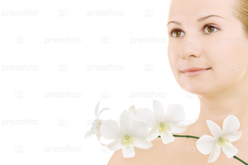 Крупным планом лицо молодой женщины с орхидеей на белом фоне
