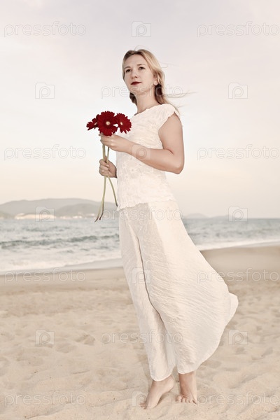 Молодая женщина на пляже с цветами в руках