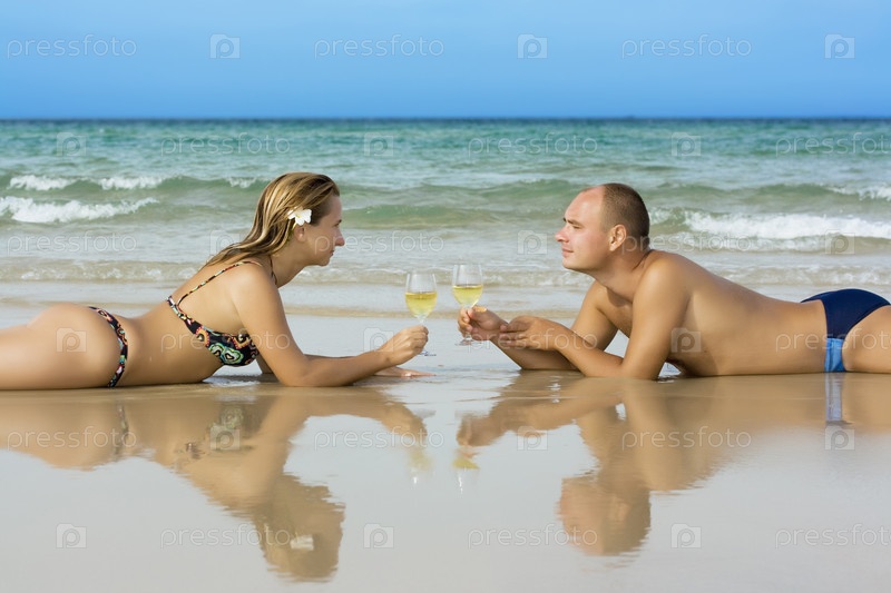 Влюбленная пара с бокалами вина лежит на морском пляже