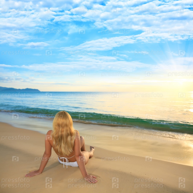 Женщина на берегу моря на рассвете
