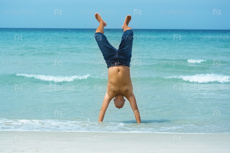 Мужчина стоит на руках на морском пляже