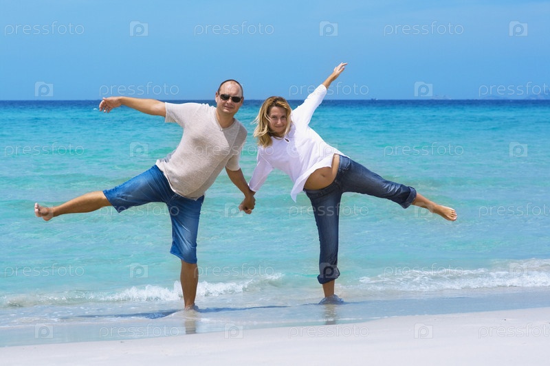 Влюбленная пара веселится на морском пляже