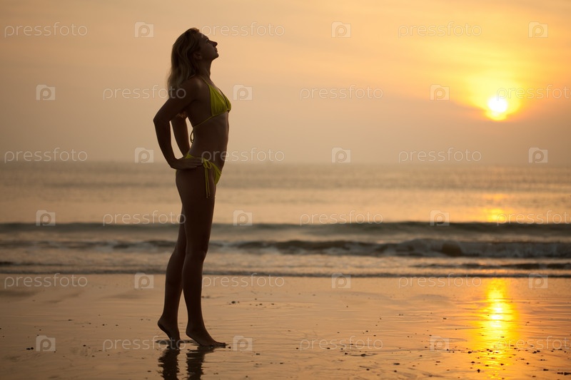Молодая женщина на пляже на рассвете