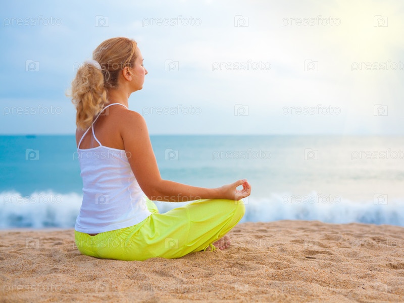 Молодая женщина медитирует на пляже на рассвете