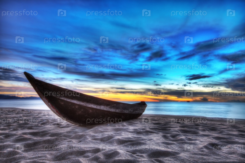 Старая рыбацкая лодка на рассвете на пляже