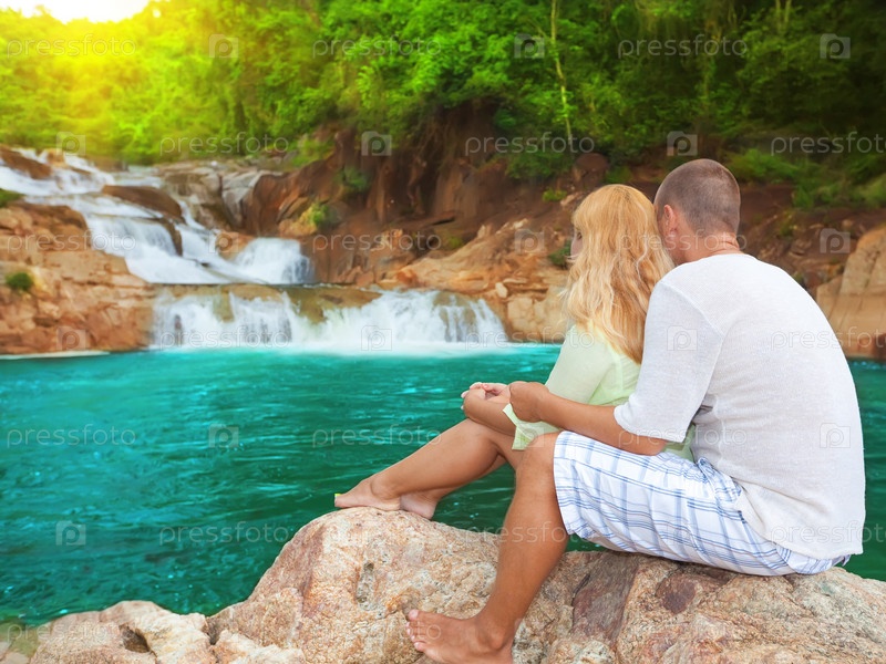 Пара возле водопада на восходе