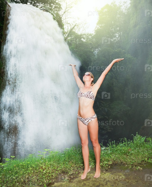 Молодая женщина с поднятыми вверх руками возле водопада