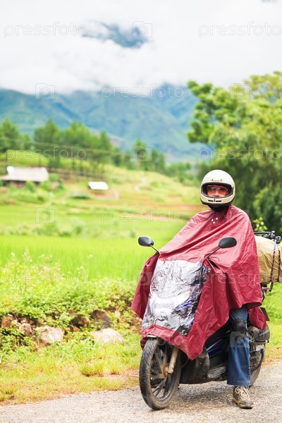 Мужчина на мотоцикле, дождь, сельская местность