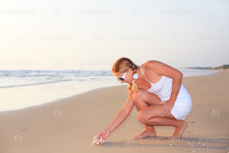 Женщина собирает ракушки на пляже