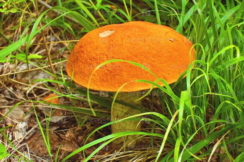 Большой оранжевый подосиновик на фоне зеленой травы и бурых листьев