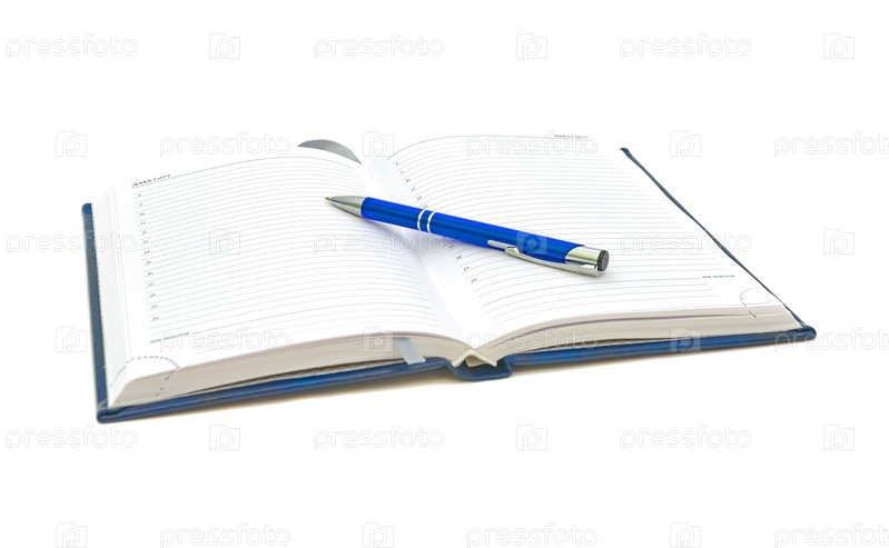 Раскрытая записная книжка и ручка на белом фоне