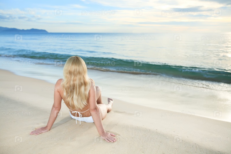 Женщина сидит на берегу океана на рассвете