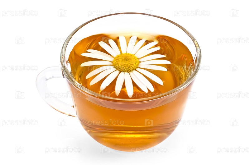 Травяной чай и цветок ромашки в стеклянной чашке на белом фоне