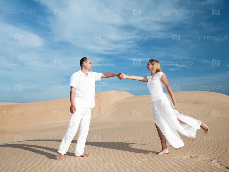 Пара в белой одежде танцует в пустыне
