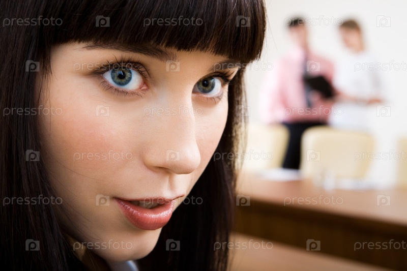 Лицо красивой брюнетки с очаровательными глазами на фоне людей