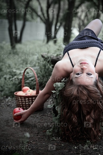 Красивая стройная женщина лежит с яблоком в руке на свежем воздухе