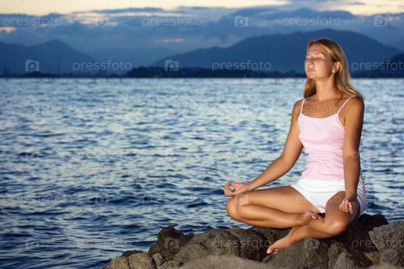 Молодая женщина медитирует на закате вблизи океана