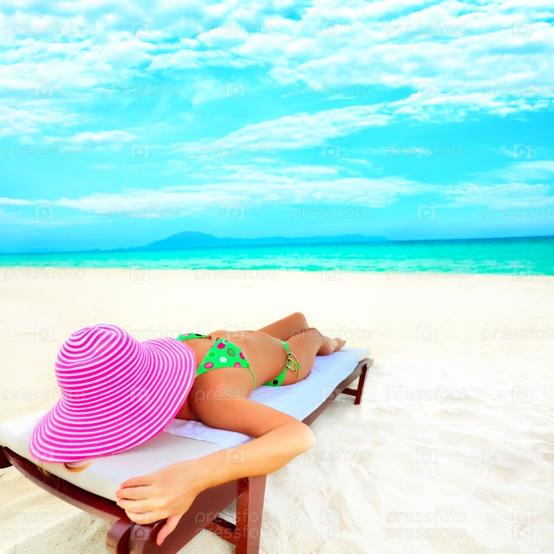 Девушка загорает на шезлонге на берегу океана